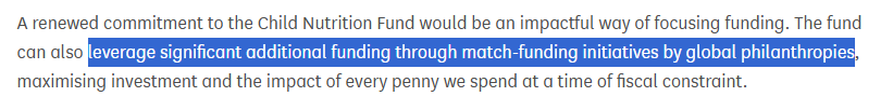 NOTE: Incomplete information was provided at the time of this contribution; the relevant statement is therefore updated as highlighted in bold; ‘the £502m in matching funds through the various rounds between 2011 and today represents just 0.3% of the UK’s ODA.’